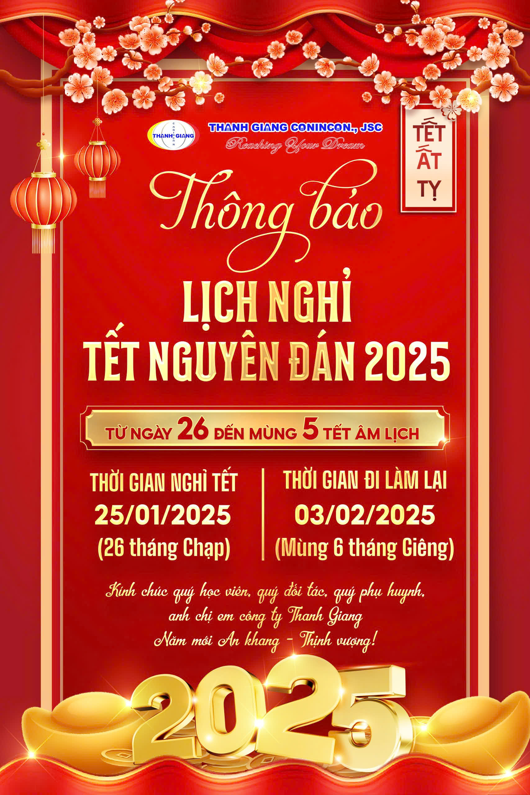 THÔNG BÁO LỊCH NGHỈ TẾT NGUYÊN ĐÁN 2025