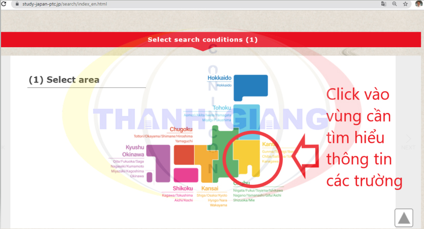 Ví dụ các bạn muốn tìm thông tin các trường vùng Kanto thì các bạn click chuột vào vùng Kanto