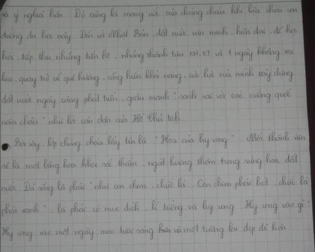 Bởi vậy lớp chúng cháu lấy tên là " Hoa của hi vọng". Mỗi thành viên sẽ là một bông hoa khoe sắc thắm, ngát hương thơm trong rừng hoa đất nước. Đã sống là phải " như con chim chiếc là". Con chim phải hót, chiếc là phải xanh, là phải có mục đích, lí tưởng và hi vọng., hi vọng vào 1 ngày mai tươi sáng và đẹp đẽ hơn.