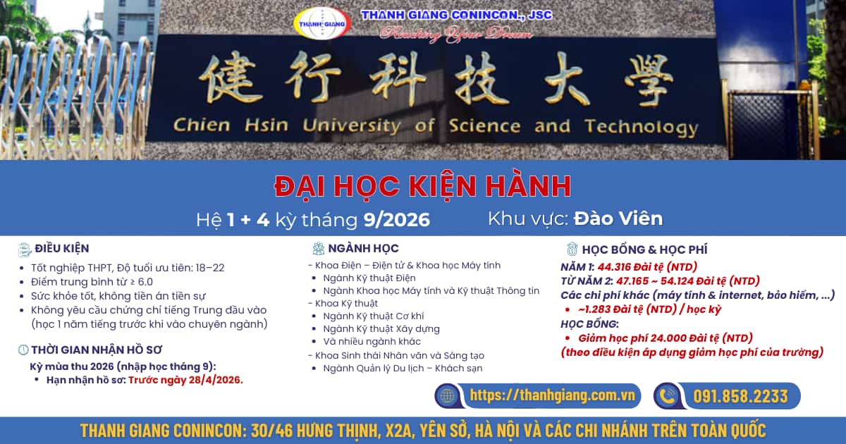 Với mô hình đào tạo linh hoạt, định hướng thực tiễn và chi phí phù hợp, chương trình du học hệ 1+4 tại Đại học Kiện Hành kỳ thu 2026 là một lựa chọn đáng cân nhắc cho học sinh Việt Nam có kế hoạch du học Đại học Đài Loan trong giai đoạn tới.