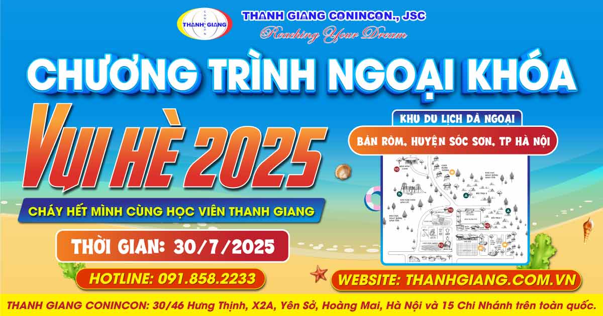 Mỗi mùa hè đến là dịp để các bạn học viên Thanh Giang tạm gác lại bài vở, cùng nhau bước ra khỏi lớp học, tận hưởng thiên nhiên và tăng thêm sự gắn bó với bạn bè, thầy cô. Năm nay, chương trình dã ngoại mang tên "Thanh Giang – Vui Hè 2025" sẽ chính thức diễn ra vào ngày 30/7/2025 tại khu du lịch sinh thái Bản Rõm – Sóc Sơn, Hà Nội.