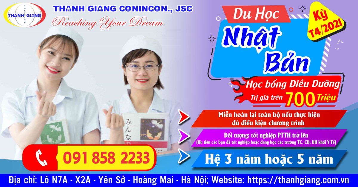Thanh Giang xin giới thiệu chương trình “Học bổng điều dưỡng đặc biệt” với giá trị học bổng tối đa lên đến 700 điệu đồng, bao gồm 1 năm học phí trường tiếng và 2 năm học phí trường senmon điều dưỡng.