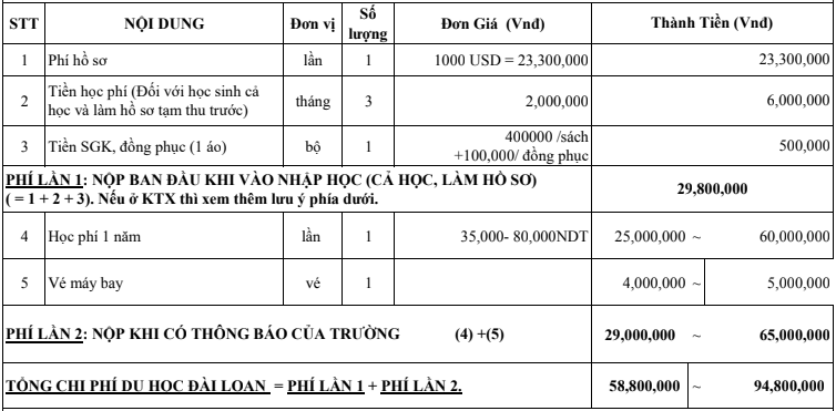 Lưu ý: Nếu bạn nào được học bổng toàn phần vẫn cần phải mang khoảng 10.000 Đài Tệ (7 triệu VNĐ) để chi tiêu và mua sắm các vật dụng trong hai tháng đầu tiên khi chưa nhận được học bổng của nhà trường. Còn những bạn nào được học bổng bán phần thì phải chuẩn bị tiền ở Ký Túc Xá – Tiền ăn – Tiền học phí (50% học phí)