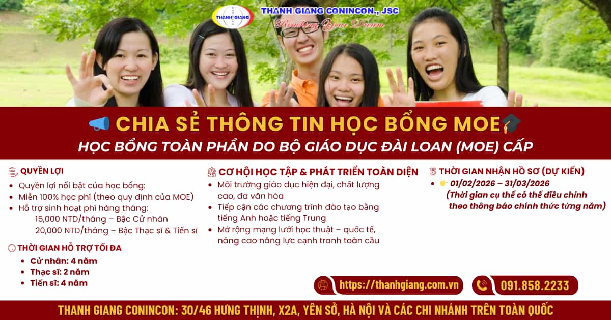 Nếu bạn đang quan tâm đến học bổng MOE và du học Đài Loan, hãy liên hệ ngay với Thanh Giang qua fanpage hoặc gọi đến hotline: 091.858.2233 để được tư vấn chi tiết về điều kiện, hồ sơ và lộ trình chuẩn bị phù hợp với năng lực của bạn nhé!