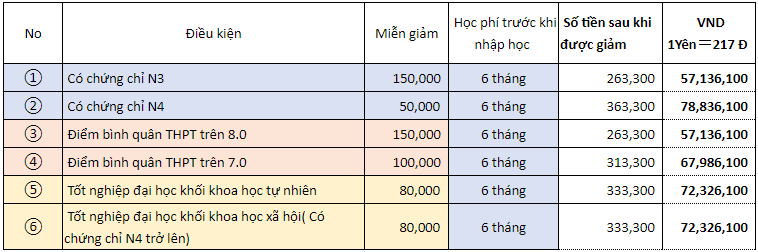 Nếu học sinh tốt nghiệp đại học + bằng JLPT N3 + Điểm học bạ trên 8 = Tổng số tiền miễn giảm 380,000 yên.