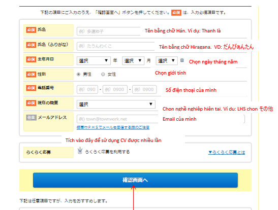 9.Sau khi hoàn thành bản trên thì nhấn: 確認画面へ