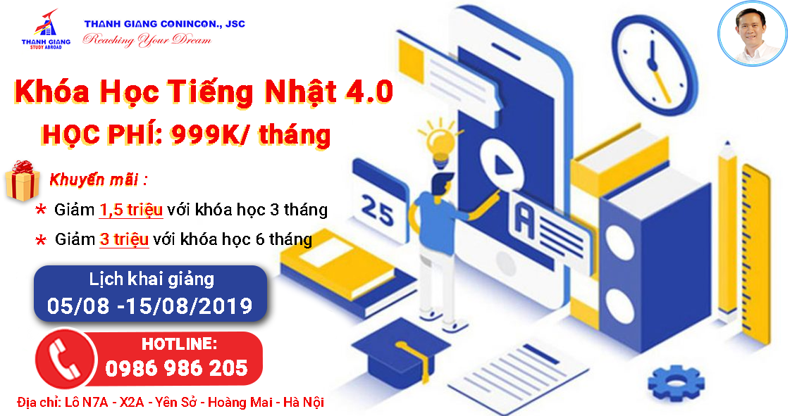 Chuẩn bị cho kỳ nhập học và năm học mới 2019 -2020, từ đầu tháng 8/2019 Thanh Giang sẽ chính thức khai giảng khóa học tiếng Nhật 4.0 với chương trình đào tạo mới cam kết chỉ sau 3 tháng đào tạo học viên sẽ được học đầy đủ chương trình đào tạo N5, có thể giao tiếp và thi được chứng chỉ tiếng Nhật N5, và sau 6 tháng đào tạo học viên có thể hoàn thành chương trình học để thi chứng chỉ N4 với những bạn chăm chỉ học tập. Đặc biệt, học phí của khóa học tiếng Nhật 4.0 so với các khóa học thông thường giảm đến 1,5 triệu đồng/khóa 3 tháng và 3 triệu đồng/khóa 6 tháng.