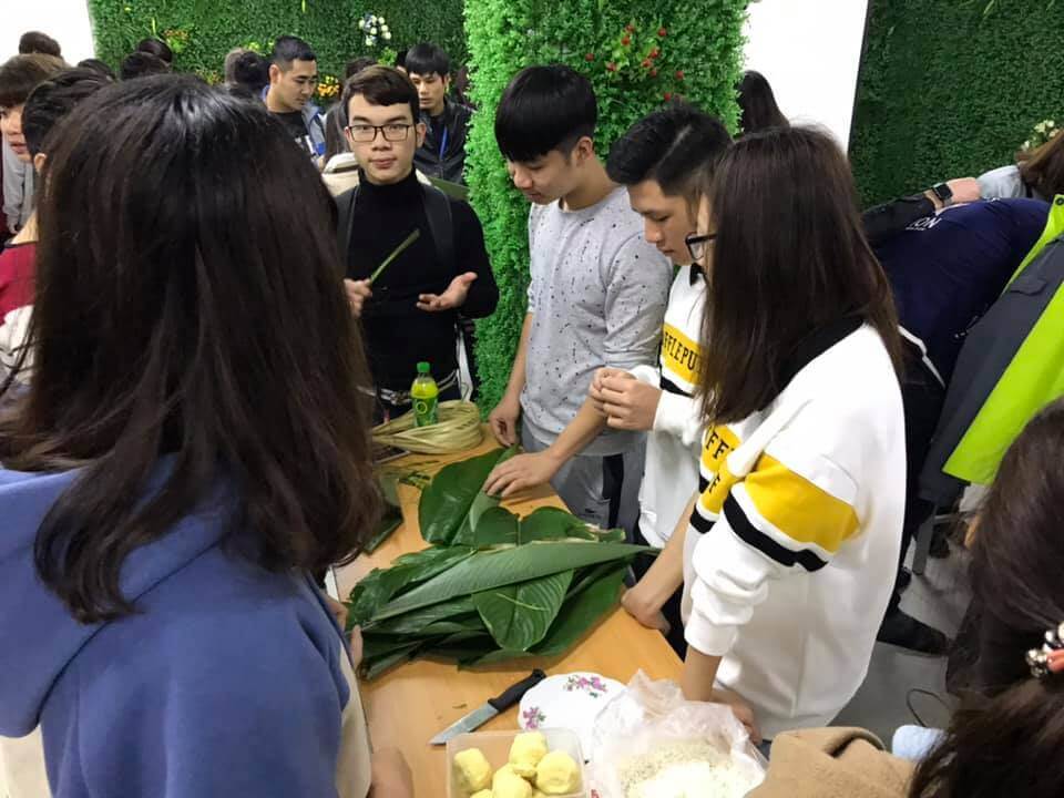 Mỗi lớp, phòng ban phải tự chuẩn bị mọi nguyên liệu như lá dong, gạo, đỗ, thịt… cho đến việc cắt lá tạo hình khuôn bánh.