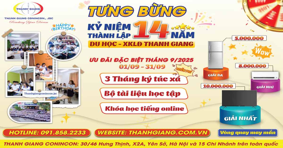 Nếu bạn đang tìm hiểu về chương trình du học hay xuất khẩu lao động. Đừng bỏ lỡ cơ hội ưu đãi nhân dịp sinh nhật 14 năm thành lập tại Thanh Giang nha. Hãy inbox ngay cho fanpage của Thanh Giang hoặc gọi đến hotline 091.858.2233 để được tư vấn chi tiết và nhận ưu đãi đặc biệt nhé.
