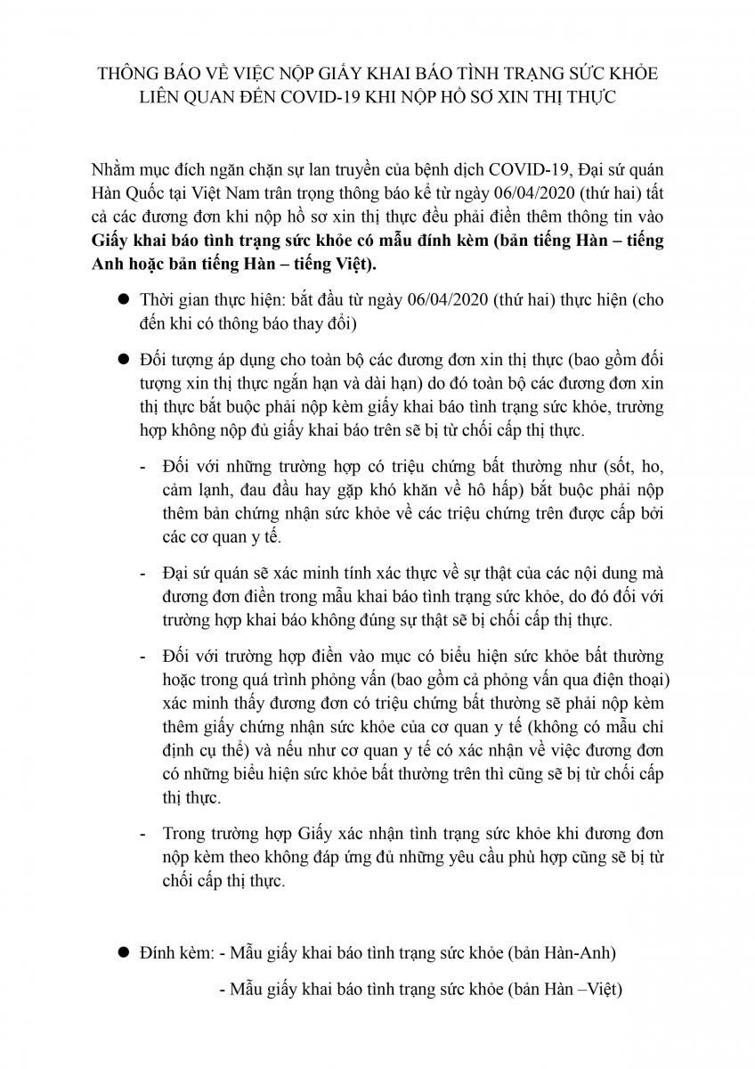 Thông báo về việc nộp giấy khai báo tình trạng sức khỏe liên quan đến COVID-19 khi nộp hồ sơ xin thị thực