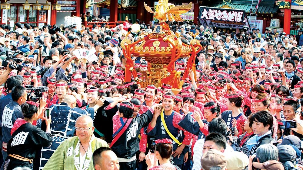 Diễn ra vào những tháng 5 lẻ tại thành phố Tokyo, sẽ có nhiều sự kiện như diễu hành, rước kiệu… vật tế sẽ được tổ chức trong suốt một tuần. Ngày đầu tiên, những người tham gia diễu hành sẽ mặc trang phục của thời Heian, Kimono được trang trí kèm nhiều phụ kiện. Theo tập tục thì lễ hội này được tổ chức để mời các vị thần và linh hồn trở về đền để cầu chúc may mắn đến với tất cả mọi người.