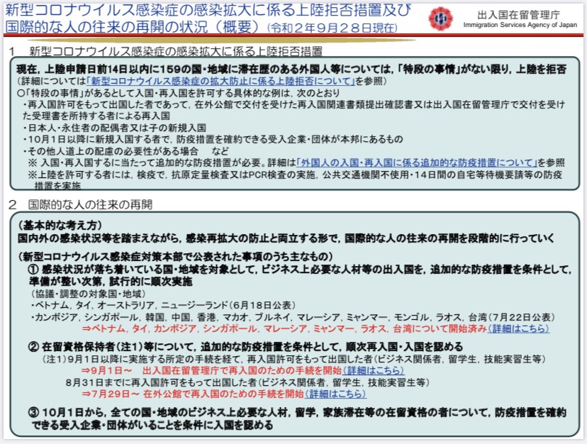 Theo thông báo chính thức ngày 28/9, dựa trên các biện pháp khôi phục việc đi lại từng đoạn với các nước khác , Chính phủ Nhật sẽ cho công dân của một số quốc gia nằm trong "vùng an toàn" nhập cảnh.