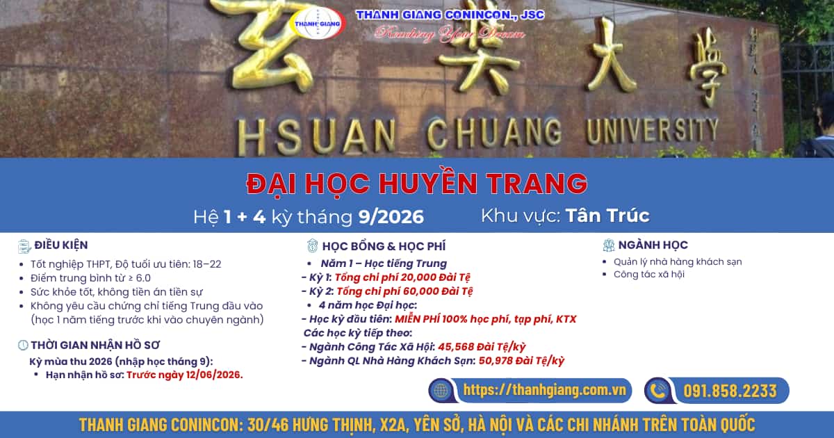 Chương trình du học hệ 1+4 tại Đại học Huyền Trang kỳ thu 2026 là lựa chọn phù hợp cho những bạn muốn du học Đài Loan với lộ trình rõ ràng, chi phí hợp lý và không yêu cầu tiếng Trung đầu vào.