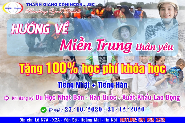 Liên tiếp chịu ảnh hưởng của bão và áp thấp nhiệt đới, miền Trung vừa trải qua trận “mưa lũ lịch sử”, gây ra những thiệt hại nặng nề. Cùng với cả nước “hướng về khúc ruột miền Trung”, Thanh Giang áp dụng ưu đãi đặc biệt, Tặng học phí 6 tháng trị giá lên tới 10,2 triệu đồng cho học viên có Hộ khẩu thường trú tại 4 tỉnh miền Trung khi đăng ký hồ sơ Du học/ XKLĐ tại Thanh Giang Thời gian áp dụng chương trình từ ngày 27/10/2020 – 31/12/2020.