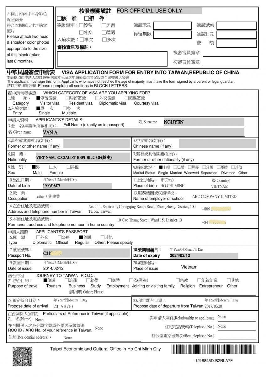 Mẫu đơn xin Visa du học Đài Loan